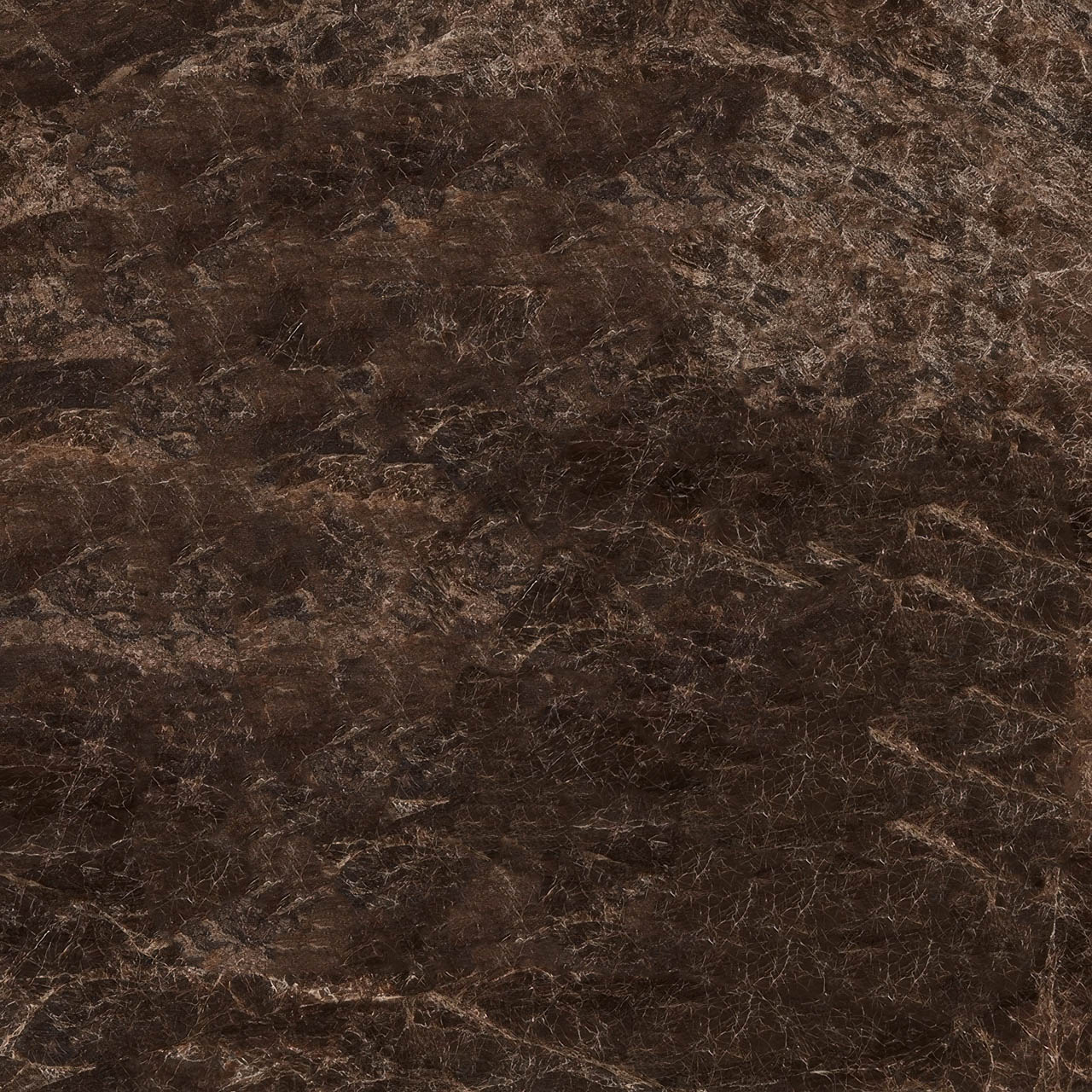 Dark Emperador is a high-density, brecciated brown marble quarried primarily in Spain. It is characterized by its deep hazel/tobacco background interlaced with erratic light-colored calcite veins and occasional “spider-web” clusters.